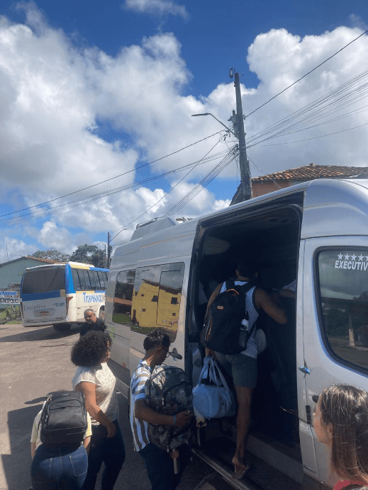 A ida ao Marajó aconteceu às 7h do dia 19 de fevereiro. A saída se deu do Porto de Balsas de Icoaraci, distrito administrativo de Belém. Após a travessia pela Baía do Marajó, o desembarque foi realizado no porto de Camará, por volta das 10h, já em território marajoara. De lá, em uma van a equipe seguiu pela rodovia PA-154, percorreu paisagens marcadas por florestas, campos naturais, campinaranas, áreas similares à fitofisionomia do Cerrado e pequenas comunidades rurais até chegar ao quilombo Vila União/Campina às 10h20. Em geral, esse deslocamento geográfico de Belém à comunidade é uma imersão gradual na realidade socioambiental do arquipélago e permite a qualquer visitante perceber as especificidades logísticas e territoriais que moldam o cotidiano das populações locais. Nele, foi visto o mosaico do bioma amazônico (que não é somente floresta) em um curto período de tempo.