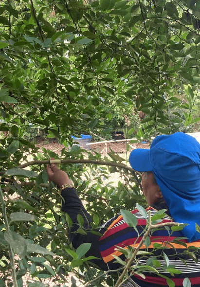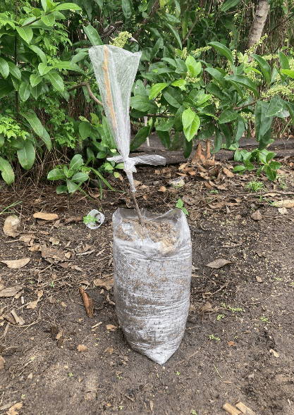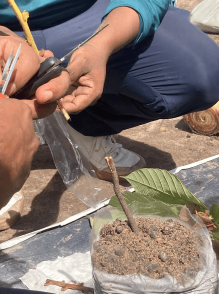 Na demonstração de enxertia, utilizou-se uma muda de cupuaçu cedida por uma agricultora, da qual se retiraram as folhas, mantendo o porta-enxerto (denominado de “cavalo”), para ser inserida verticalmente no saco plástico com substrato. Em seguida, a ponta do enxerto foi afunilada e encaixada no porta-enxerto. Orientou-se o isolamento da muda por cerca de 25 dias para garantir recuperação adequada. A técnica foi apresentada como estratégia para antecipar a frutificação e melhorar a produtividade no quintal das mulheres.