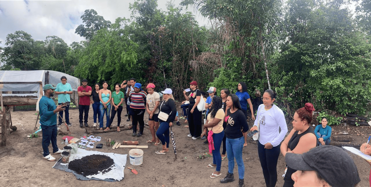 A atividade esteve vinculada ao projeto Agroforestry climate-resilient in quilombola communities of the Brazilian Amazon, financiado pelo Instituto Interamericano para Pesquisas sobre Mudanças Globais (IAI), coordenado no Brasil pela professora Dra. Monique Medeiros e cuja proposta é fortalecer sistemas agroflorestais resilientes às mudanças climáticas em quilombos amazônicos. Os estudantes foram convidados a colaborar com duas oficinas previamente demandadas pelas pesquisadoras comunitárias que constituem a equipe do projeto A primeira, voltada ao cuidado e à manutenção de mudas, atendia a uma demanda concreta e operacional, diretamente vinculada às rotinas produtivas do território. A segunda, dedicada à gestão de dados em ambiente digital compartilhado, respondia a uma necessidade técnica relacionada à sistematização, organização e salvaguarda das informações produzidas no âmbito do próprio projeto.