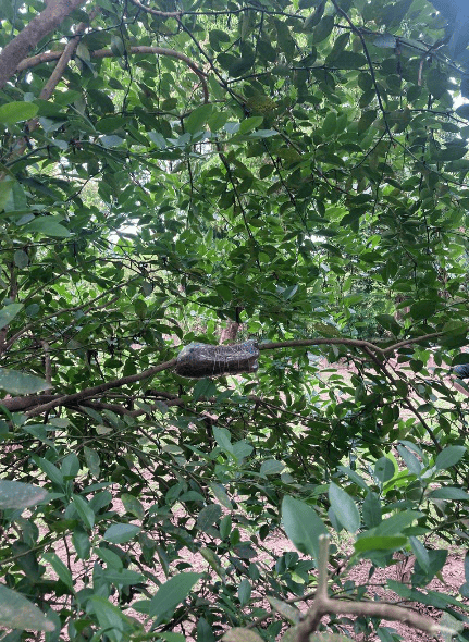 Já a alporquia foi realizada em uma aceroleira (pelos estudantes) e em um limoeiro (pelas agricultoras) mediante anelamento da casca, aplicação do substrato e envolvimento com dois tipos de plástico: saco plástico na árvore de acerola, garrafa plástica no limoeiro. Primeiro, as agricultoras assistiram ao procedimento realizado pelos estudantes na árvore de acerola e, em seguida, emularam o método na árvore de limão.